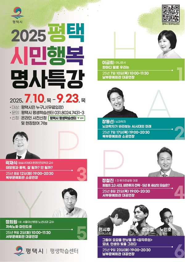 별도로 마련된 ‘지역명사특강’은 7월 24일부터 9월 18일까지 이어지며 평택의 역사와 시민 정신을 되새기는 뜻깊은 시간이 될 예정이다.