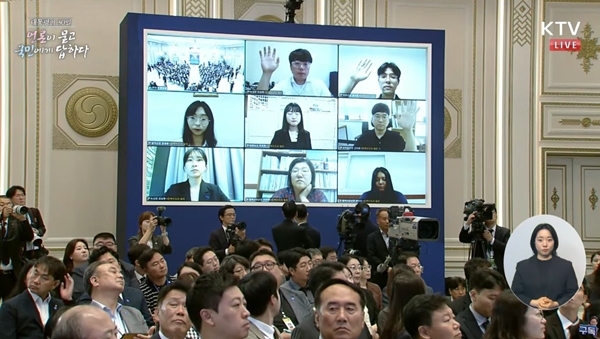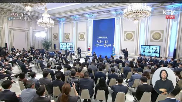 이 대통령은 ‘대통령의 30일, 언론이 묻고 국민에게 답하다’를 주제로 100분의 시간을 마련했다. 회견에는 국내 매체 119곳, 외신 28곳 등이 참여했다. 풀뿌리 지역언론은 권역별로 한 매체씩 선정됐으며 수도권을 대표한 평택시민신문은 김윤영 취재부장과 한아리기자가 참여했다. 이외에도 뉴스민(영남), 담양뉴스(호남), 서귀포신문(제주), 설악신문(강원), 옥천신문(충청)이 초청돼 총 8명의 기자가 화상으로 참여했다. 화상 연결 관련 기술적 문제를 고려한 일부 대기인원도 포함됐다. 이들은 벽면에 설치된 ‘미디어월’ 화면을 통해 원격으로 회견에 참여했다.