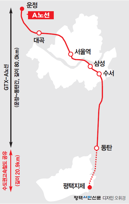 GTX-A 평택 연장 사업은 본선 구간 종착점인 동탄역부터 평택지제역까지 20.9km를 연장하는 사업이다. 이 사업이 완료되면 평택지제역에서 서울역까지 37분, 일산 킨텍스까지 52분이 각각 소요돼 평택시에서 서울·경기북부권으로의 이동이 한결 편리해질 전망이다.