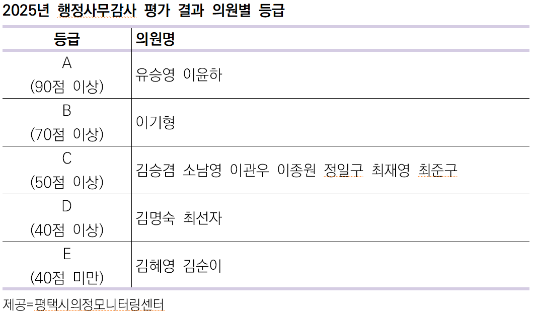 평택시의정모니터링센터(평시모)는 7월 21일 2025 행정사무감사 모니터링 활동 결과 보고를 발표하고 A~E 5단계로 나눠 등급별 명단을 공개했다.