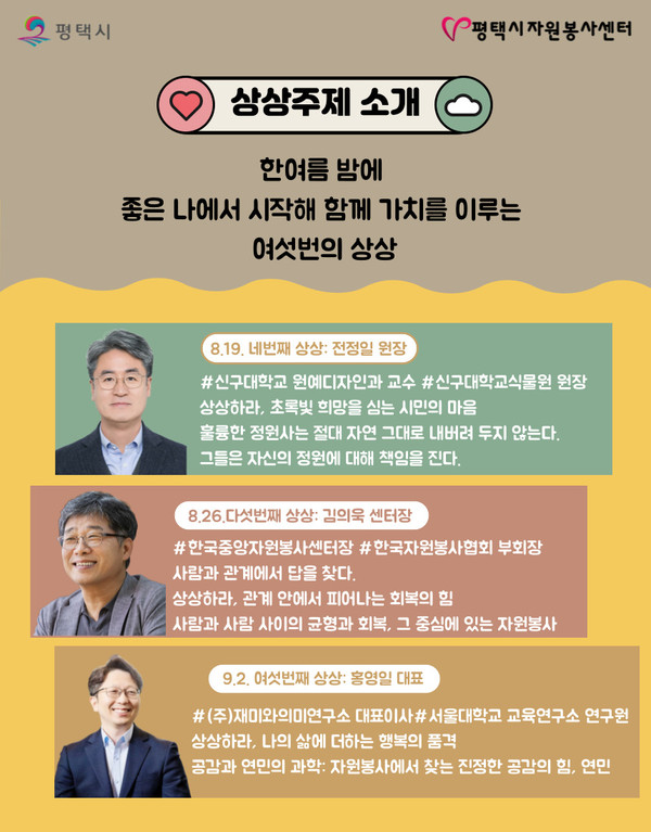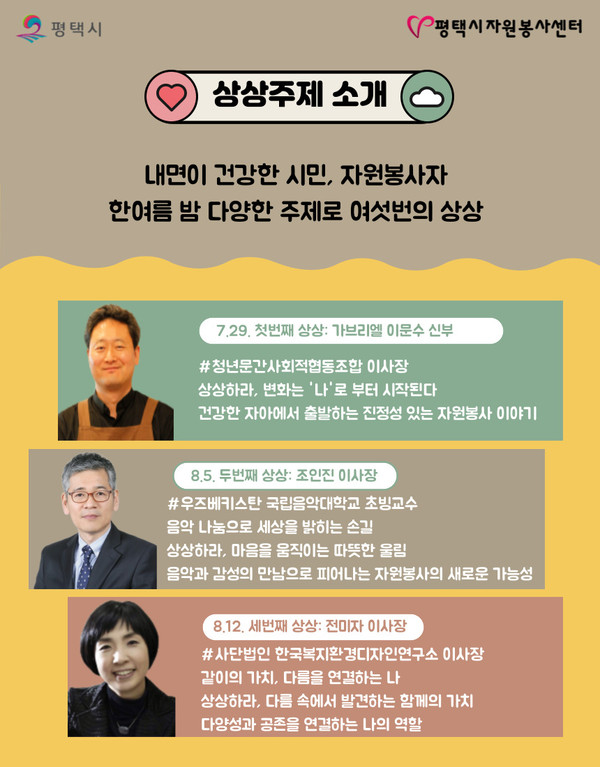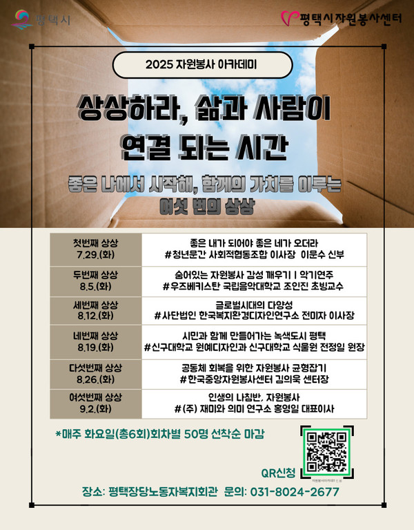 평택시자원봉사센터는 ‘상상하라, 삶과 사람이 연결되는 시간’을 주제로 ‘자원봉사 아카데미’를 7월 29일 장당노동자복지회관에서 개강한다.