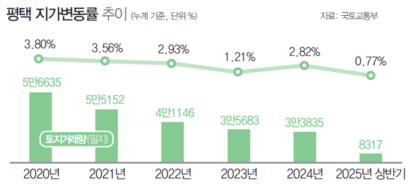 국토교통부와 한국부동산원이 최근 발표한 ‘2025년 상반기 연간 지가변동률 및 토지거래량’ 자료를 보면 2025년 1~6월 평택시 지가는 0.77% 상승했다. 이는 지난해 같은 기간 1.67%보다 0.9%포인트 낮아진 수치다. 또 경기도 평균 상승률 1.17%는 물론 전국 평균 1.17%에도 못 미치는 수준이다.