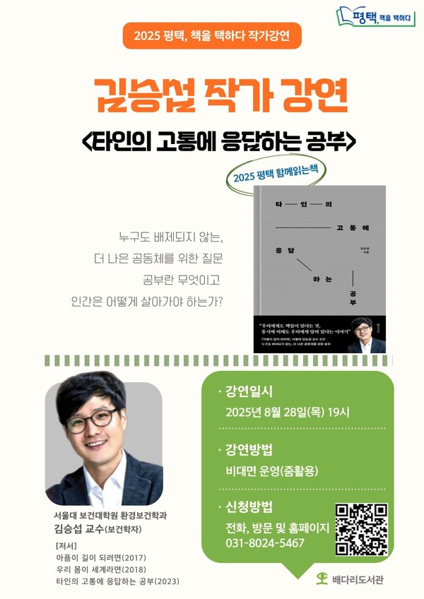평택시 시민독서운동 ‘평택, 책을 택하다’ 2025년 함께 읽는 책 <타인의 고통에 응답하는 공부> 김승섭 작가 강연이 8월 28일 오후 7시 비대면으로 진행된다.