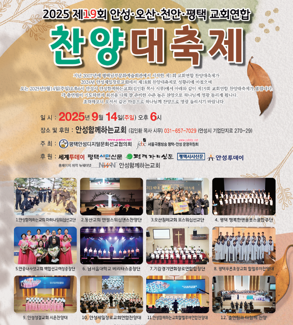 제19회 안성·오산·천안·평택 교회연합 찬양대축제가 9월 14일 안성함께하는교회에서 성대한 마을 올린다.