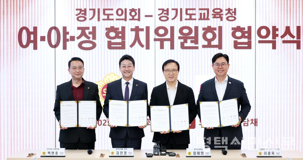이날 도의회에서 열린 협약식에는 임태희 교육감과 김진경 의장, 백현종 국민의힘 대표의원, 이용욱 더불어민주당 총괄수석부대표의원 등이 참석했다.