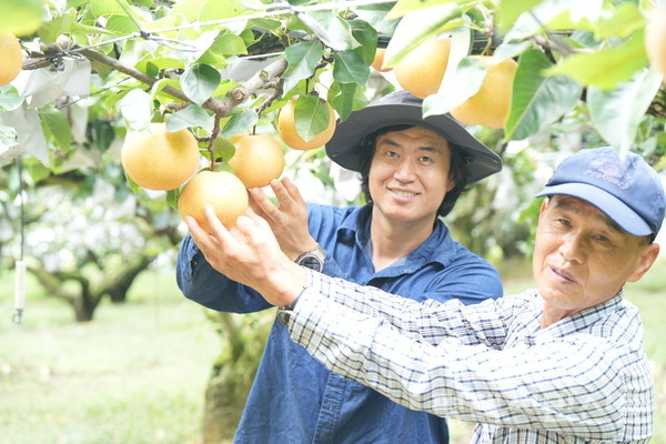 9월 18일 죽백동에 있는 배 과수농가에서 주인 이갑수(오른쪽) 씨와 아들 이세의 씨가 추석을 앞두고 배 상태를 살펴보고 있다. 아버지 이갑수 씨는 “올해 유난히 변덕스러웠던 날씨 속에서도 잘 자라줘 고마운 마음”이라고 웃어 보였다. 농장에서는 현재 추석 출하를 위한 마지막 점검 작업이 한창이며, 당도와 색깔, 크기 등을 꼼꼼히 살펴보며 최고 품질의 배만을 선별하고 있다.