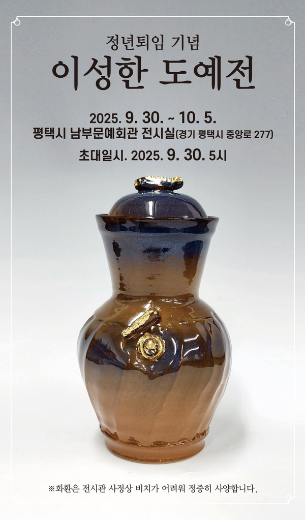 이성한 교수는 “학문과 교육의 길을 걸어온 여정을 마무리하며, 삶의 또 다른 표현인 도자 작품으로 인사드리고자 한다”며 “지난 발자취를 함께 돌아보고 앞으로의 길을 따뜻한 마음으로 축복해 달라”고 말했다.