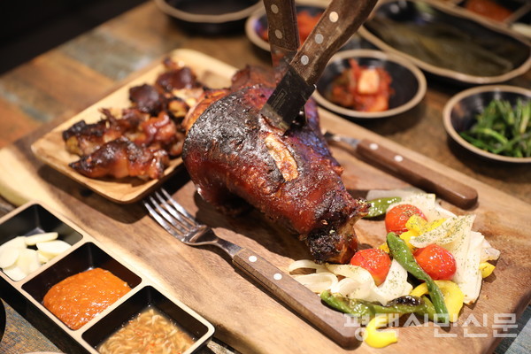 삶은 족발을 500도 천연 화산석 화덕에 한번 더 구웠다