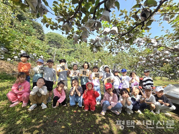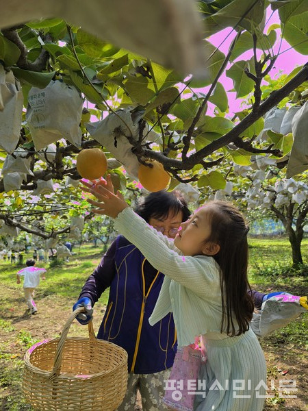 이날 원생들은 꼬마 농부가 되어 까치발을 들거나 발판을 딛고 나무에 매달린 배를 두 손으로 조심스럽게 수확했다. 또 저장력과 당도가 높은 평택의 대표 농특산물인 슈퍼오닝 배를 직접 보고 그림을 그리며 “배를 어떻게 먹을까?”, “누구와 함께 나눠 먹을까?” 이야기를 나눴다.