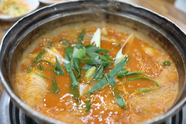 이곳 김치찌개의 비결은 텁텁하지 않으면서도 시원하고, 가볍지 않은 깊은 맛에 있다. 한 시간 동안 푹 끓인 육수에 비법 소스와 각종 채소를 넣고, 김치 줄기와 목전지 살을 통으로 넣어 느끼하지 않고 개운한 맛을 낸다. 함께 제공되는 집게와 가위로 김치와 고기를 원하는 크기로 잘라 먹는 재미도 쏠쏠하다. 푸짐한 양도 이곳의 장점이다.